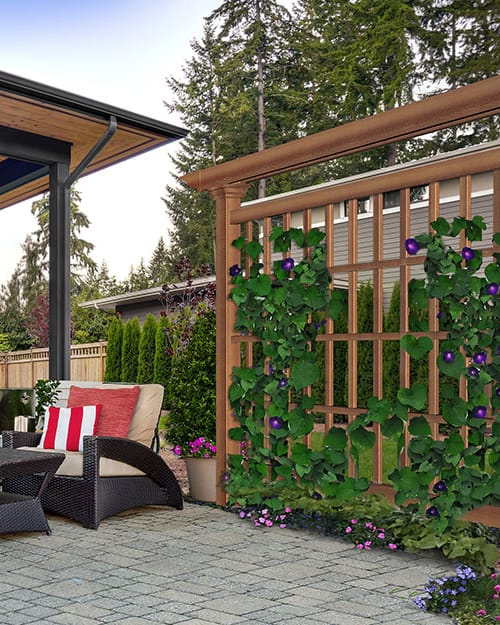 Installing a patterned trellis adds decor and a cozy atmosphere to your backyard. Trellises and growing climbers as a charming and natural wall between you and the neighbors is an option. For an overgrown tropical feel, you can match a trellis to your deck, add a lattice fence, and add multiple flowerpots.